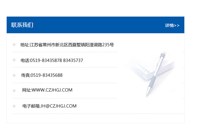 地址:常州市新北區友邦商務大廈1幢16、17層  電話:0519-85101652  傳真:0519-85112595  郵編:213022  網址:www.cz-jiayue_cn.sz-whbz.com  郵箱:xiajifengaa@163.com